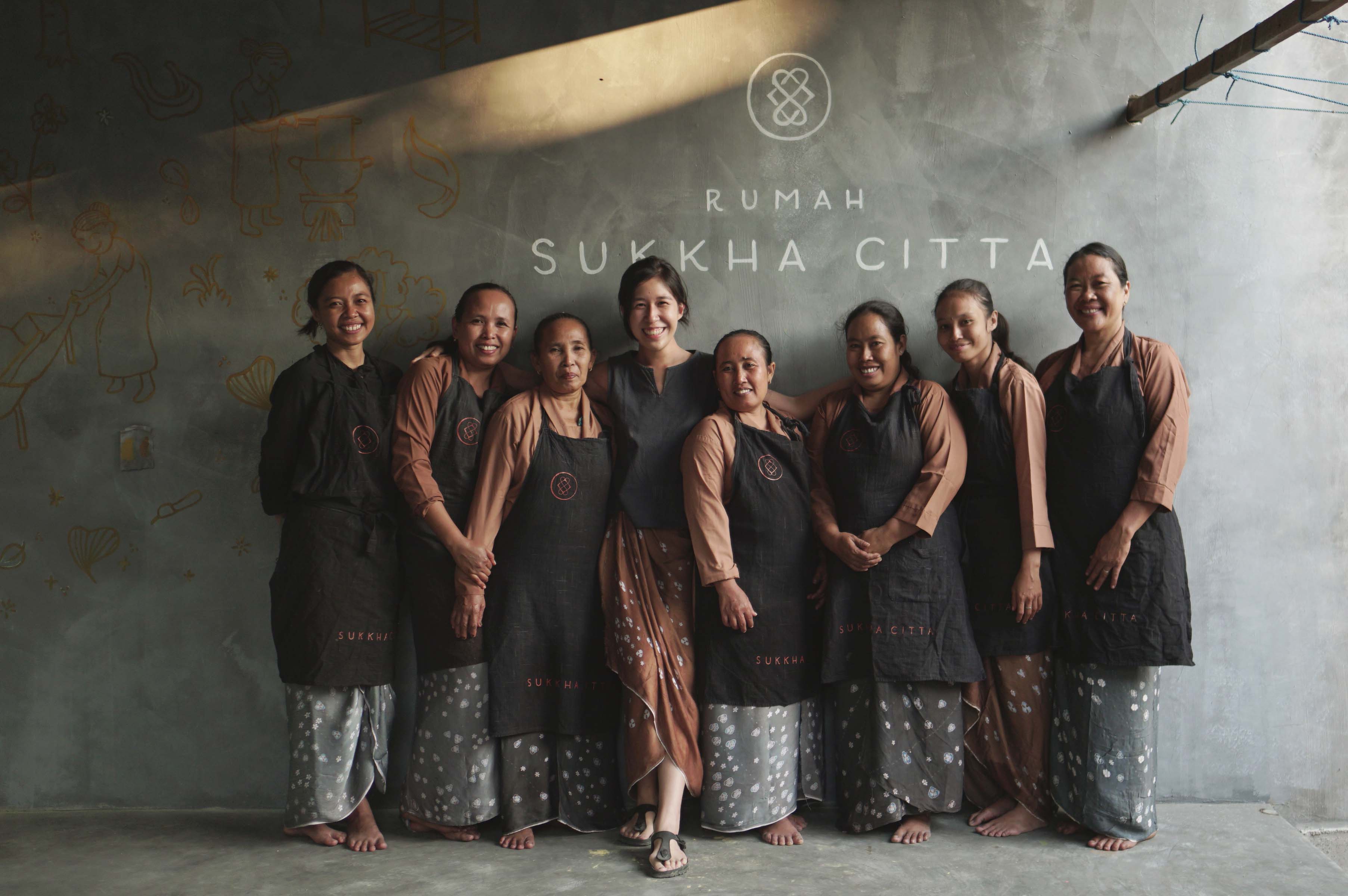 Riadini-Flesch (fourth from left) with women artisans at Rumah SukkhaCitta, where ecological literacy and heritage craft are taught together.