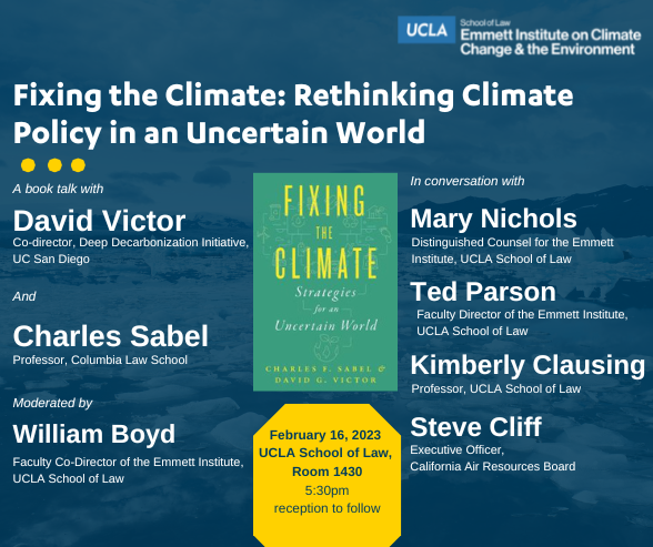 Global climate diplomacy is stalling thanks to the same top-down approach used since the Kyoto Protocol. That’s the argument made by David Victor (UC San Diego) and Charles Sabel (Columbia Law School) in their book “Fixing the Climate: Strategies for an Uncertain World.” Hear them discuss how policymakers should approach climate governance in this timely and provocative conversation with faculty from UCLA’s Emmett Institute.