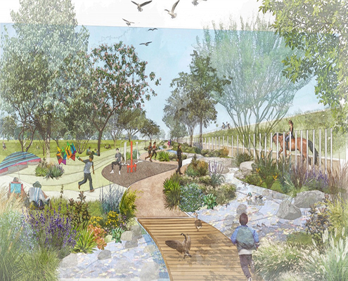 It’s the year 2050, and the Los Angeles River runs lazily along, sparkling in the sunlight, as the hum of freeway traffic weaves through the idyllic setting.