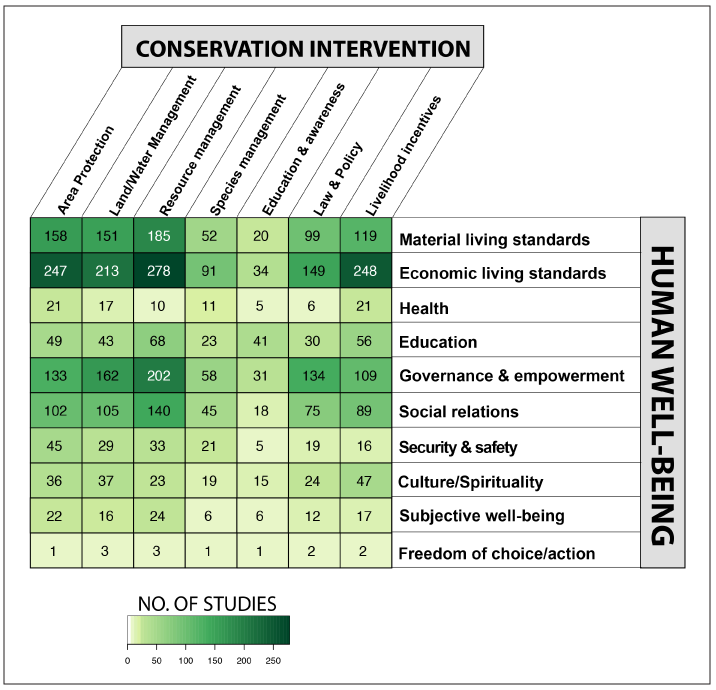 They found lots of evidence about how protecting nature affects communities economically, as well as affecting governance, and people’s social relations. But they found that a lot more research is needed on the relationships between conservation and factors such as human health, security, safety, and people’s subjective sense of well-being before robust recommendations can be drawn from the evidence.