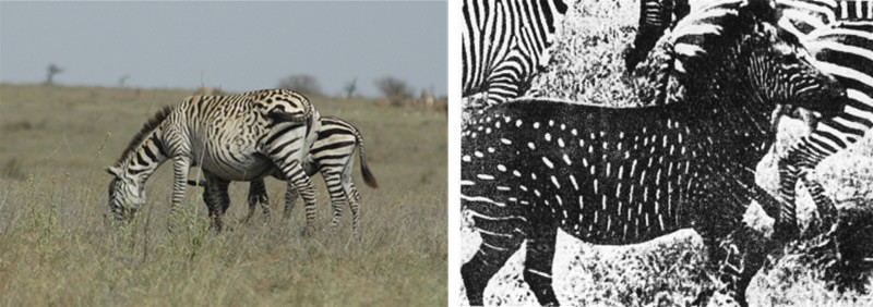 Spotted zebra photographed in Nairobi National Park in Kenya in 2009. Right: Spotted zebra from Botswana photographed in 1967.
