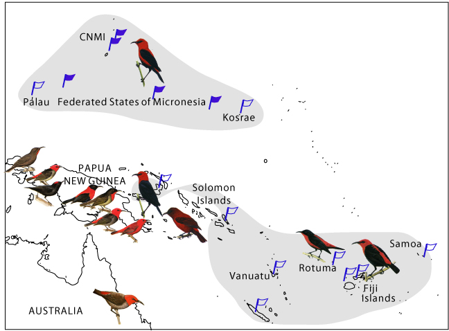 Fig. 2. Map showing the Myzomela honeyeater distribution in the Pacific. Solid flags indicate populations that have been sampled for song, plumage coloration, and DNA so far.